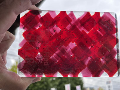 来年から更に取扱いのバリエーションが広がるアートガラスですが、見本をお借りして写真撮影しましたので1色ずつご紹介していこうと思います。赤色のアートガラスはクリムゾンレッドです。透明なガラスの中に気泡が散りばめられ、赤とピンクのランダムな模様が入っています。この見本で100mm×150m、厚さが20mmですがずっしりと重さを感じます。曇天での撮影でもこの鮮やかさですから日光を直接通すともっとキラキラと輝いて見えたはずです。このアートガラスを墓石の一部に組み込んで使う事により、オリジナリティの高いお墓となる事間違いなしです。ガラスという事で割れやすいのでは?とよく聞かれますが硬度は石材とほぼ同じです。ガラスの材料はほぼ石から取り出せる鉱物を溶かして出来ていますから当然なんです。ガラスというとコップや昔の家の窓ガラスというイメージがあり1mmや2mmの物なら勿論割れやすいです。しかしこのアートガラスは20mmありますから簡単に割れるものではありません。逆に石であっても1mmや2mmの厚さなら割れやすくなります。車の窓ガラスやお店のショーウインドウなど、ある程度の厚さのガラスは夏に酷暑になっても、冬に極寒になっても又強風や大雨などでも割れませんから元々かなりの強度があるんですね。年々新規建墓数が少なくなっていますが、その少ない建墓数の中でアートガラス等を使ったオリジナリティの高いお墓と規格墓所のようにカタチが決まっていて低価格のお墓とに2分されています。ガラスのお墓に興味がある方は是非ご相談ください。