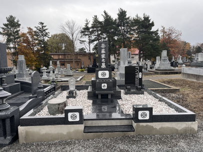 10月28日、思いもよらぬ積雪となり旭川市や東神楽町を含む周辺7町は一面銀世界になりました。大雪霊園・柏木ヶ岡墓地も工事が出来ないほど積雪し、おおよそ10㎝くらいの雪がお墓の上に積もっていました。道路と違い中々融けない墓地霊園の雪、石材は気温が下がるとともに冷たくなり雪が融けずらくなります。次の日の雨でも完全に融けず、さらに翌日朝にバーナーで基礎の上の雪を融かし基礎を乾かしてから石積み工事をはじめました。こちらのお墓は旭川市営旭山共同墓地にを建っていたものを、町内柏木ヶ岡墓地に移転工事したものです。とは言っても元々基礎コンクリートは移転工事が出来ない為に新設となり、面積も3坪から4坪に広くなりましたので外柵も新設となりました。ご主人の希望で元は白御影を使っていた外柵はお墓と同じ濃いグレー系の石材に変更し、お地蔵さんの台や墓誌の台も濃いグレーの石材に交換いたしました。墓参道も飛び石では歩きにくい事から石貼りにしました。後日お預かりしている遺骨を施主様と一緒に納骨して本年度最後の建て込み工事が完了します。次の積雪で根雪になるかもしれませんので、残っているお墓じまい4件と小工事5件の施工を急ぎたいと思います。10月から来年の新築工事のご契約が次々と入って来ています。この後も商談を進めていく大きな案件が数件あり来年は春から大忙しとなりそうです。